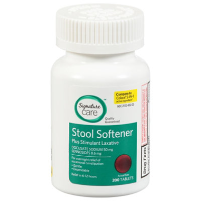The combination of 50 milligrams of docusate sodium stool softener with 8 6 milligrams of sennosides stimulant laxative per dose allows water and fats to soften the stool making elimination more comfortable.