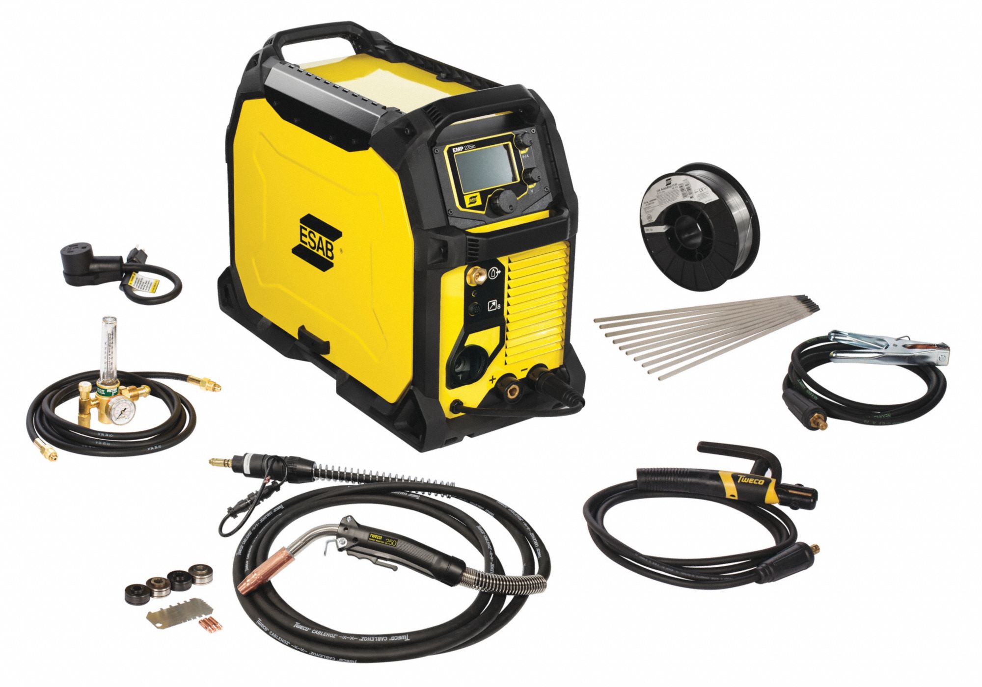 It comes complete with everything you need to start mig or stick welding except the shielding gas.