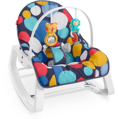 The fisher price infant to toddler rocker starts out as an infant rocker or stationary seat with bat at toys overhead.